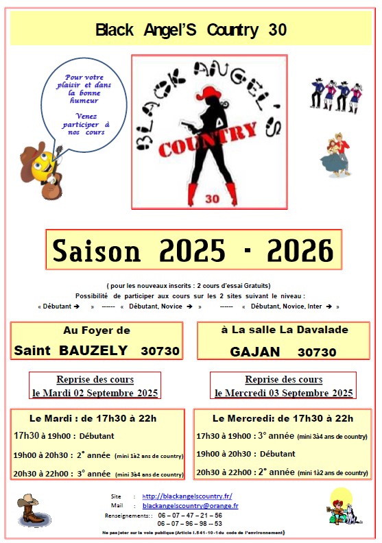 – Les Black Angel’S Country 30 co-organisent pour la troisième année consécutive avec l’élevage du Moulin du domaine du Piefaud de Guylaine et Fabien Pradeilles, en Ardèche, un Festival Country le week end des 04-05 et 06 Juillet 2025 à Mazan l’Abbaye 07510, qui clôturera une année bien remplie.