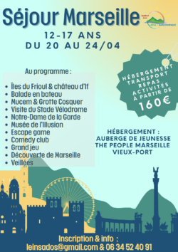 Bonne nouvelle pour les jeunes de 12 à 17 ans : le séjour à Marseille approche et les inscriptions ouvrent à partir du lundi 9 mars ! Pendant 5 jours et 4 nuits, les jeunes partiront à la découverte de la cité phocéenne avec un programme riche : Îles du Frioul et Château d’If Balade en bateau MUCEM & Grotte Cosquer Visite du Stade Vélodrome Notre-Dame de la Garde Musée de l’Illusion Escape game Comedy club Grand jeu, découverte de la ville…