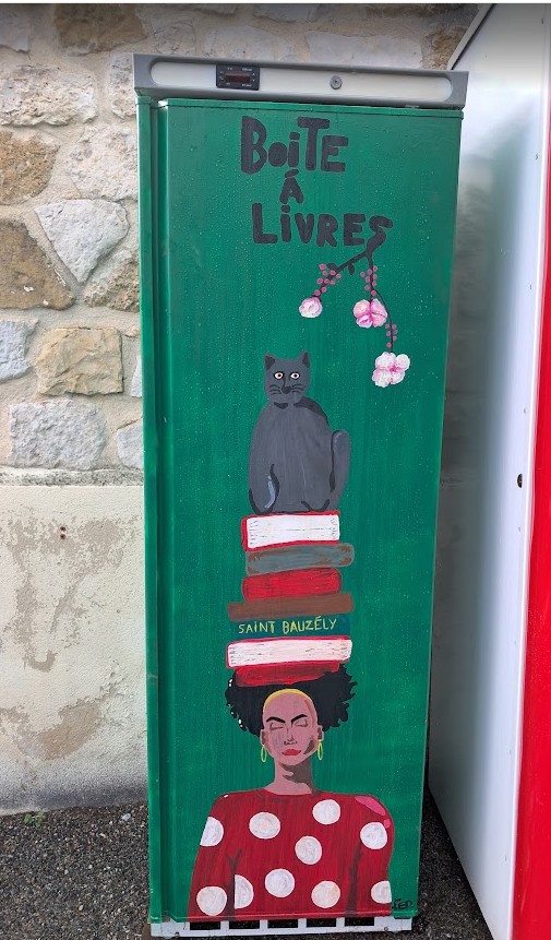 Sur la place, à côté du distributeur de pains, nous avons mis en place d’une nouvelle boîte à livres customisée par Louca.